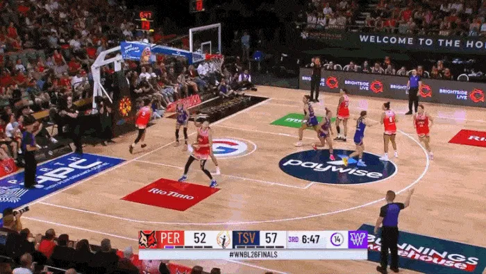 韩旭在篮下的二次进攻。(韩旭在WNBL联赛有明显的身高优势)